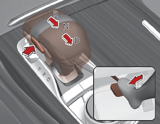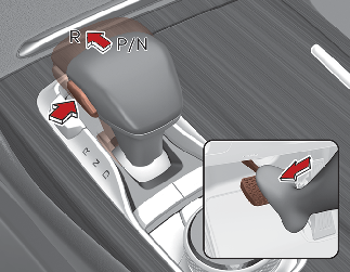 브레이크 페달을 밟고 변속레버 앞쪽에 위치한 「P RELEASE」 버튼을 누르면 「N」(중립)단으로 변속됩니다.