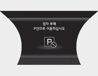 「P」단 변속 기능을 포함하여 변속기와 변속레버의 변속이 정상적으로 작동하지 않을 때 표시창에 경고문이 표시됩니다.