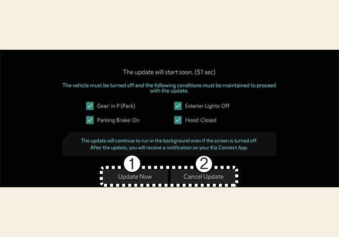 Если вы нажмете кнопку Start на экране, автомобиль начнет установку обновления автоматически. Все указанные ниже условия должны быть выполнены.