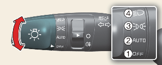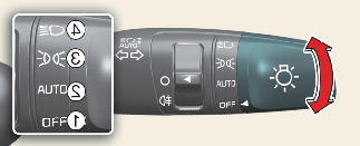 Для управления фарами поверните кнопку на конце рычага в одно из следующих положений:
