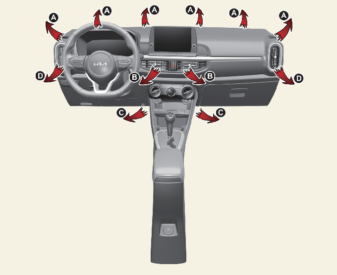 Основная часть воздуха направляется в нижнюю часть салона, а незначительное его количество подается на лобовое стекло и к боковым соплам для предотвращения обмерзания.