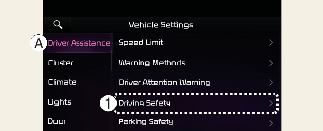 Виды предупреждений можно настроить, когда двигатель находится в положении «ON» (Вкл.). Выберите пункты Пользовательские установки → Помощь водителю → Виды предупреждений в меню настроек в комбинации приборов или Настройки → Автомобиль → Помощь водителю → Виды предупреждений в меню настроек информационно-развлекательной системы, чтобы изменить следующие настройки: