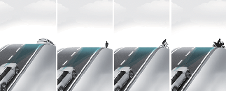 На иллюстрации выше показано изображение, которое камера переднего вида и передний радар могут определить как транспортное средство, электросамокат, пешеход или велосипедист.