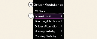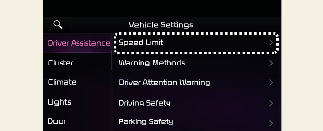 При включенном двигателе выберите пункты Пользовательские установки → Помощь водителю → Контроль безопасного вождения → Ограничение скорости в меню комбинации приборов или Настройки → Автомобиль → Помощь водителю → Ограничение скорости на экране информационно-развлекательной системы.