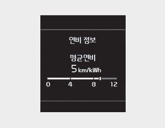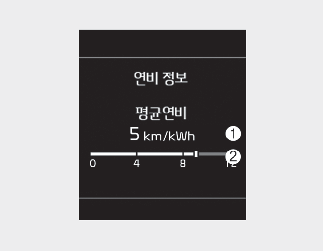 평균 연비 초기화 (--.-) 시점부터 현재까지의 주행 거리와 구동용 배터리 소모량을 누적 계산하여 평균 연비를 표시합니다.