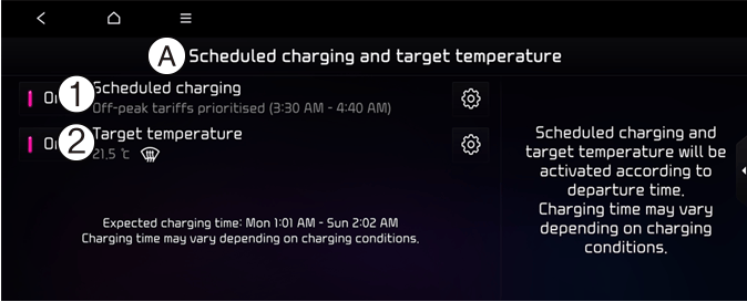 If the target temperature (1) is set with the cable connected, the cabin temperature will be adjusted to the target temperature at departure time. In cold weather, pre-scheduled heating helps enhance electric vehicle performance by heating the vehicle in advance.