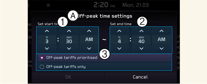 1. If selected, start charging only on the designated off-peak time. If deselected, start charging only on the scheduled time.