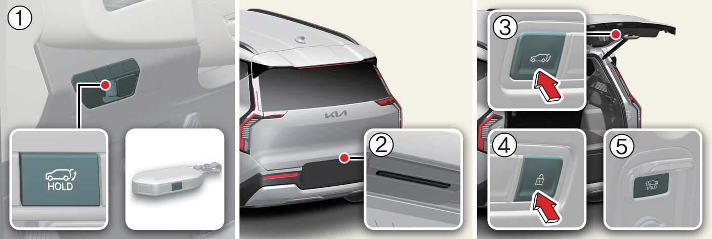 Pulse el botón de bloqueo del portón trasero eléctrico mientras lleva la llave inteligente. El portón trasero se cierra y se bloquea automáticamente. Además, todas las puertas se bloquearán.