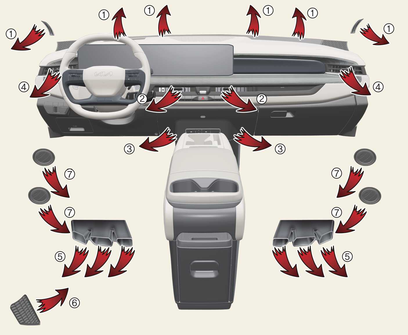 Mientras la mayor parte del aire se dirige hacia el suelo y hacia el parabrisas, una cantidad menor se dirige hacia los desescarchadores de las ventanillas laterales y las salidas de aire laterales. |