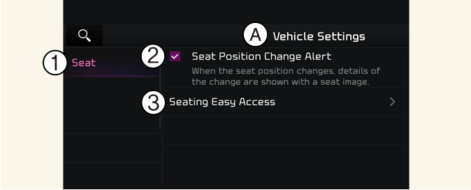 Select Setting → Vehicle → Seat from the Settings menu in the infotainment system screen, you may use various convenience functions.