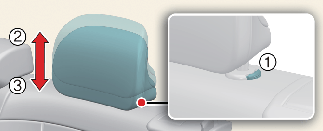 • To lower the headrest, push and hold the release button (2) on the headrest support and lower the headrest to the desired position (3).