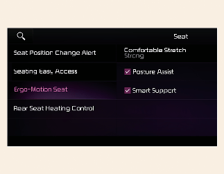 Чтобы включить или отключить функцию «Smart support» (Умная опора) выберите в меню «Settings» (Настройки) на экране информационно-развлекательной системы «Setup» (Настройка) → «Vehicle Settings» (Настройки автомобиля) → «Seat» (Сиденье) → «Ergo-Motion Seat» (Сиденье Ergo-Motion) → «Smart Support» (Умная опора).