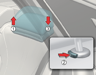 Чтобы опустить подголовник, нажмите кнопку фиксатора (2) на опоре подголовника и, удерживая ее, опустите подголовник в требуемое положение (3).