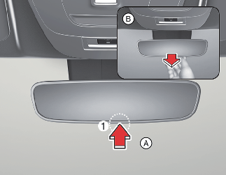 Потяните переключатель дневного/ночного режима (1) на себя, чтобы уменьшить слепящий свет от фар автомобилей, едущих позади вас в ночное время.