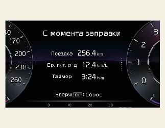 На дисплее отображается пройденное расстояние, средняя и моментальная эффективность использования топлива (или общее время в пути) после заправки.