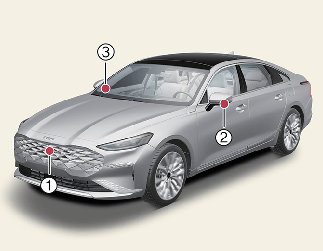 (1) SVM-камера переднего вида, (2, 3) SVM-камера бокового вида (под наружным зеркалом заднего вида)