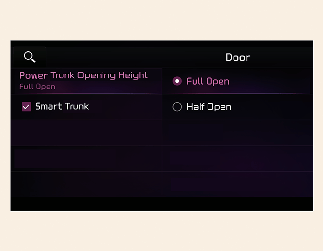 Чтобы отрегулировать высоту открывания электропривода крышки багажника, перейдите в «User Settings» (Пользовательские настройки) → «Door» (Крышка) → «Power Trunk Opening Height» (Высота открывания электропривода крышки багажника) → «Full open/Half open» (Открывание полностью/наполовину).