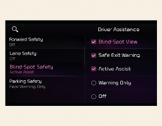 При включенном двигателе выберите в меню «Settings» (Настройки) пункт «Driver Assistance» (Помощь водителю) → «Blind-Spot Safety» (безопасность в слепой зоне) → «Safe Exit Warning» (предупреждение о выходе из автомобиля), чтобы включить предупреждения функции контроля безопасного выхода и отключить возможность их деактивации.