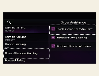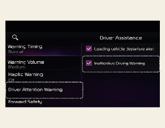 При работающем двигателе в меню «Settings» (Настройки) выберите пункт «Driver Assistance» (Помощь водителю) → «Driver Attention Warning» (Система контроля внимания) (или «DAW [Driver Attention Warning]»), чтобы включить или отключить эти функции.