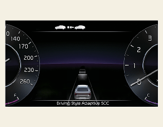 Если активирована функция адаптации под стиль вождения, на приборной панели в течение 2 секунд отобразится сообщение «Driving Style Adaptive SCC» (Адаптация смарт круиз-контроля под стиль вождения), а диапазон расстояния и расстояние до цели будут отображаться с учетом стиля вождения.