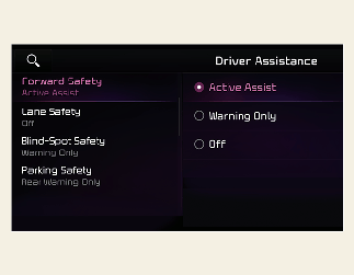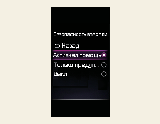 При работающем двигателе в меню «Settings» (Настройки) в разделе «Driver Assistance» (Помощь водителю) → «Forward Safety» (Безопасность впереди) включите или отключите нужные функции.