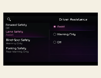 При работающем двигателе в меню «Settings» (Настройки) в разделе «Driver Assistance» (Помощь водителю) → «Lane Safety» (Безопасность движения по полосе) включите или отключите нужные функции.