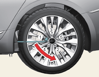 Затем расположите ключ, как показано на рисунке, и затяните гайки колеса. Следите за тем, чтобы головка ключа полностью сидела на гайке. Не становитесь на рукоять ключа ногами и не надевайте на нее удлинительную трубу. Затягивать гайки колеса нужно по окружности, через одну, пока они все не будут затянуты. После этого необходимо проверить затяжку каждой гайки. После смены колес следует проверить систему в специализированной мастерской. Kia рекомендует обратиться к официальному дилеру Kia или партнерской сервисной компании.