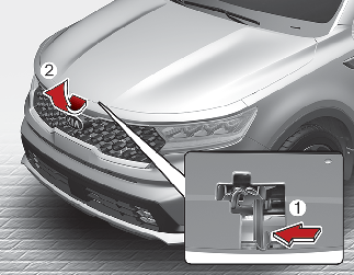 Ga naar de voorzijde van de auto en til de motorkap iets op. Duw tegen de veiligheidshaak (1) links en trek de motorkap omhoog