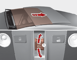Als u de hendel van het schuif-/kanteldak (1) naar achteren trekt naar de tweede stand, schuift het zonnescherm helemaal open en vervolgens schuift het schuif-/kanteldak helemaal open. Beweeg de hendel (1) kort naar voren of naar achteren om de beweging van het schuif-/kanteldak te stoppen.