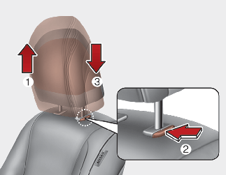 헤드레스트를 높이려면 헤드레스트를 잡고 잠기는 위치까지 위로 당겨 올리십시오(1). 헤드레스트를 낮추려면, 잠금해제 버튼을 누른 상태에서(2) 헤드레스트를 위에서 누르십시오(3).