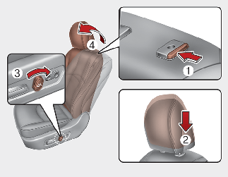 헤드레스트를 잡고 앞으로 움직여 원하는 위치로 조절하십시오. 다시 헤드레스트를 뒤로 조절하고자 할 때는 맨앞으로 당기면 맨뒤로 되돌아 갑니다. 헤드레스트와 머리 사이는 주먹 하나사이가 될 수 있도록 조절하십시오. 가까울수록 후방 추돌 시 목을 더 잘 보호할 수 있습니다.