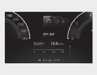 주행가능거리, 평균연비, 순간연비 등 차량 주행 정보를 표시합니다.