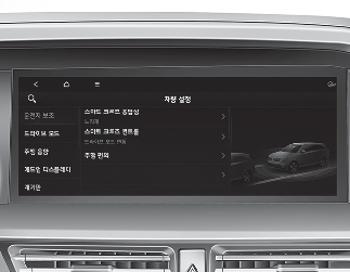 차량 설정관련 메뉴(헤드업디스플레이, 운전자보조, 드라이브 모드 등)들에 대해서 내용을 설정할 수 있습니다. 설정변경은 센터페시아 중앙측에 있는 인포테인먼트 시스템 화면 내에서 가능합니다.