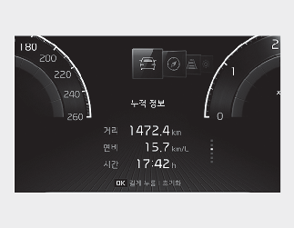 주행 거리/연비/시간 초기화 시점부터 현재까지의 누적 정보를 표시합니다.