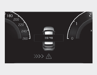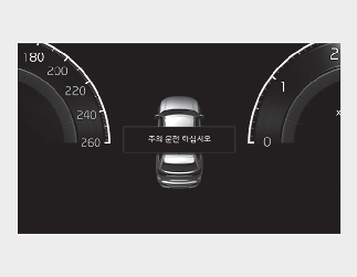 긴급 제동에 의한 정차 시 클러스터 등에 경고문이 표시됩니다. 안전을 위해 즉시 브레이크 페달을 밟고 주변 상황을 확인하십시오.