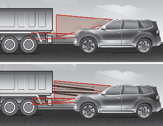 전방 차량의 차고가 높거나 적재물이 후면으로 돌출되어 있다면 위험 상황이 발생할 수 있습니다. 항상 전방 도로 상황 및 주행 상태를 확인하고 주의하여 운전하십시오. 필요하면 브레이크 페달을 밟아 직접 속도를 조절하거나 스티어링 휠을 조작하십시오.