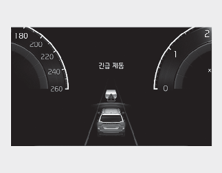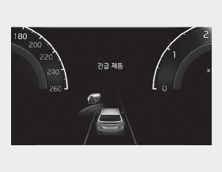 긴급 제동에 의한 정차 시 클러스터 등에 경고문이 표시됩니다. 안전을 위해 즉시 브레이크 페달을 밟고, 주변 상황을 확인하십시오.