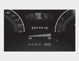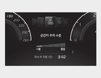 클러스터에 운전자 주의 수준이 5단계로 표시됩니다. 운전자가 부주의 운전을 하거나 휴식 없이 장시간 운전할 경우 단계가 감소합니다.