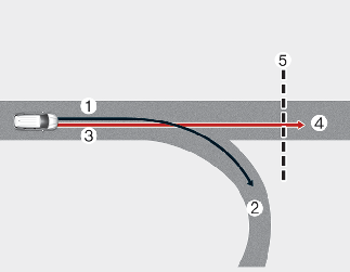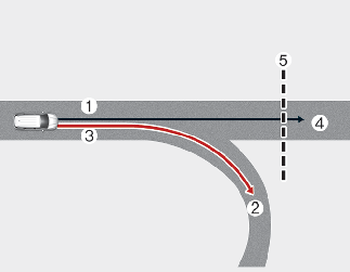 [1] : 안내 경로 [2] : 분기 [3] : 주행 경로 [4] : 본선 [5] : 안전구간 또는 곡선구간