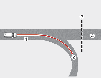 [1] : 주행 경로 [2] : 분기 [3] : 안전구간 또는 곡선구간 [4] : 본선