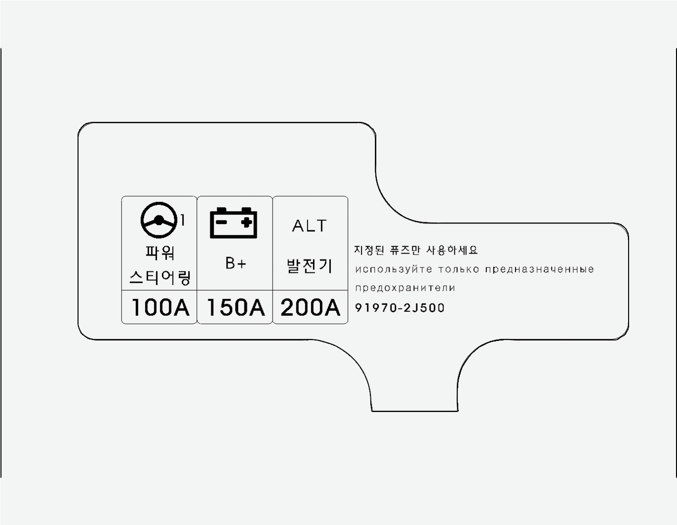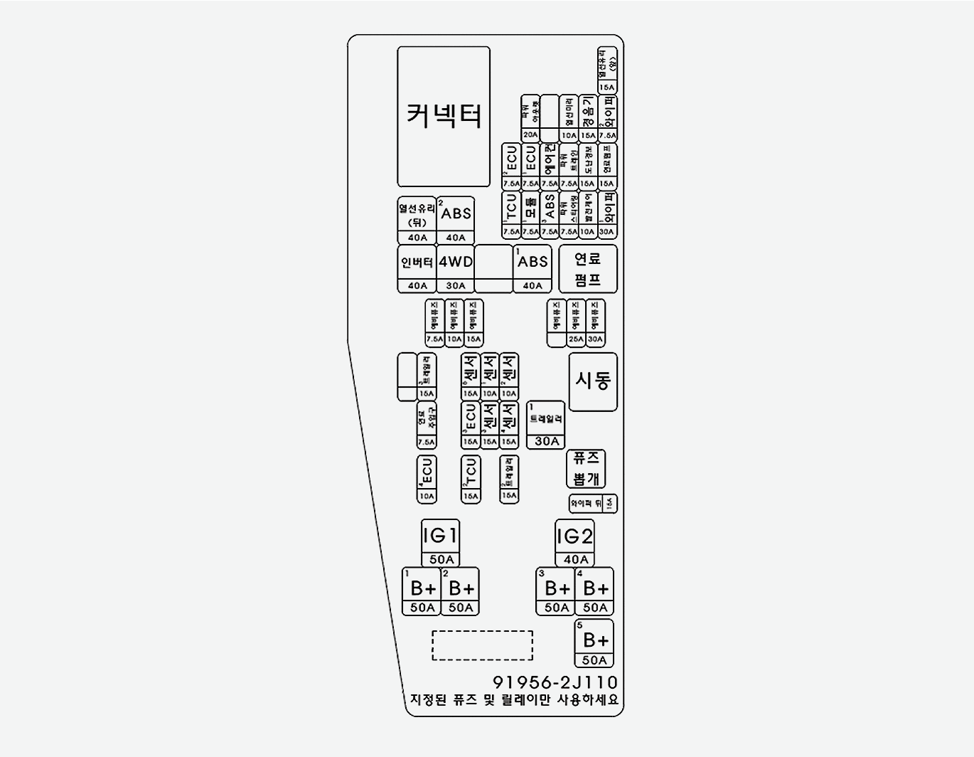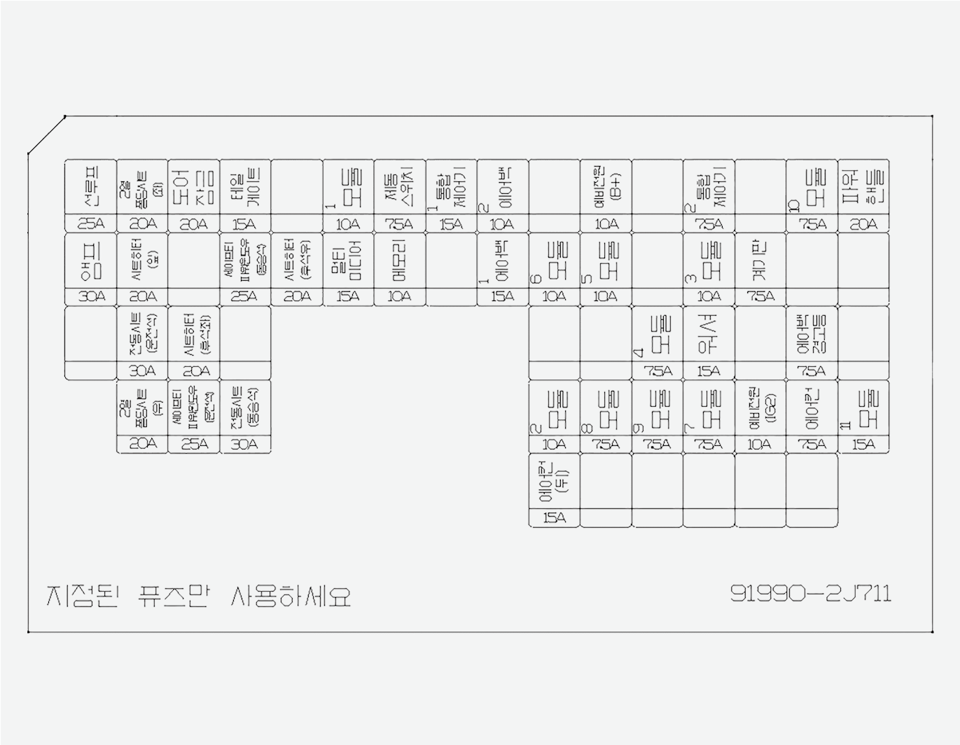 * 사양에 따라 퓨즈/릴레이 구성도가 실제 장착된 구성도와 상이할 수 있으니 박스 커버 안쪽에 부착되어 있는 퓨즈/릴레이 구성도를 참고하십시오.