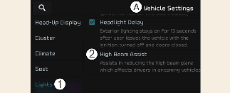 Avec le véhicule à la position ON (marche), sélectionnez Configuration → Véhicule → Feux → Assistance aux feux de route dans le menu Paramètres pour activer la fonction Assistance aux feux de route.