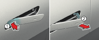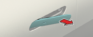Pour activer le système de déverrouillage à l'approche, sélectionnez Configuration → Véhicule → Porte → Activer le déverrouillage à l'approche dans le système d’infodivertissement. La poignée extérieure de la porte glissera vers l’extérieur et la porte se déverrouillera lorsque le conducteur s'approchera du véhicule en ayant la clé intelligente sur lui. Si le système de déverrouillage à l'approche est désactivé, la poignée de porte ne glissera pas vers l’extérieur même si le conducteur s’approche du véhicule avec la clé intelligente. Pour déverrouiller les portes lorsque le système de déverrouillage à l'approche est désactivé, touchez le capteur de verrouillage/déverrouillage (partie gravée) de la poignée.