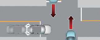 La fonction de prise de virage à la jonction peut aider à éviter une collision avec un véhicule venant en sens inverse sur une voie adjacente lorsque vous tournez à gauche à un carrefour avec le clignotant activé en appliquant un freinage d’urgence.