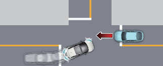 La fonction de traversée de carrefour peut aider à éviter une collision avec des véhicules venant en sens inverse sur la gauche ou la droite lors du franchissement d’une intersection en appliquant un freinage d’urgence.