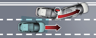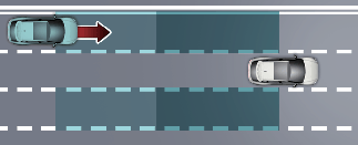 Lors d’un changement de voie par détection de la voie suivante, si l’Assistance à la prévention de collisions dans les angles morts estime qu’il y a un risque de collision avec un véhicule qui s’approche dans l’angle mort, elle aidera à éviter la collision en appliquant les freins.