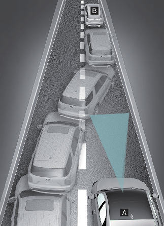 Lorsqu’un véhicule se déplace vers votre voie à partir d’une voie adjacente, il ne peut pas être détecté par le capteur tant qu’il n’est pas dans la portée de détection de celui-ci. Le régulateur de vitesse intelligent peut ne pas détecter immédiatement le véhicule lorsque celui-ci change brusquement de voie. Soyez toujours attentif à la route et aux conditions de conduite et conduisez prudemment. Si nécessaire, appuyer sur la pédale de frein pour ralentir et maintenir une distance de sécurité.