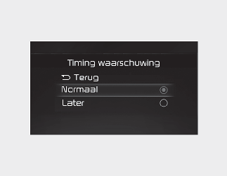 Selecteer voor het waarschuwingsmoment 'Late' ('Laat') wanneer er weinig verkeer is en wanneer uw rijsnelheid laag is.