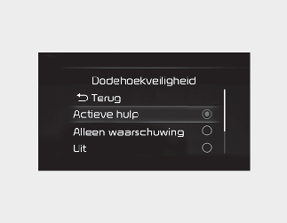 Als u de instelling wijzigt van 'Off' ('Uit') naar 'Active Assist’ ('Actieve ondersteuning’) of 'Warning Only’ ('Alleen waarschuwen’), knippert het waarschuwingslampje op de buitenspiegel gedurende ongeveer 3 seconden.