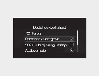 Terwijl de toets ENGINE START/STOP (Motor starten/stoppen) in stand ON staat, selecteert u 'Driver Assistance → Blind-Spot Safety → Blind Spot View' ('Bestuurdershulp → Blindehoekveiligheid → Blindehoekweergave') in het menu Settings (instellingen) om de Blind-Spot View Monitor in te schakelen en heft u de selectie op om de functie uit te schakelen.